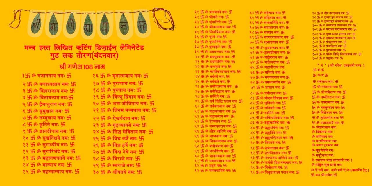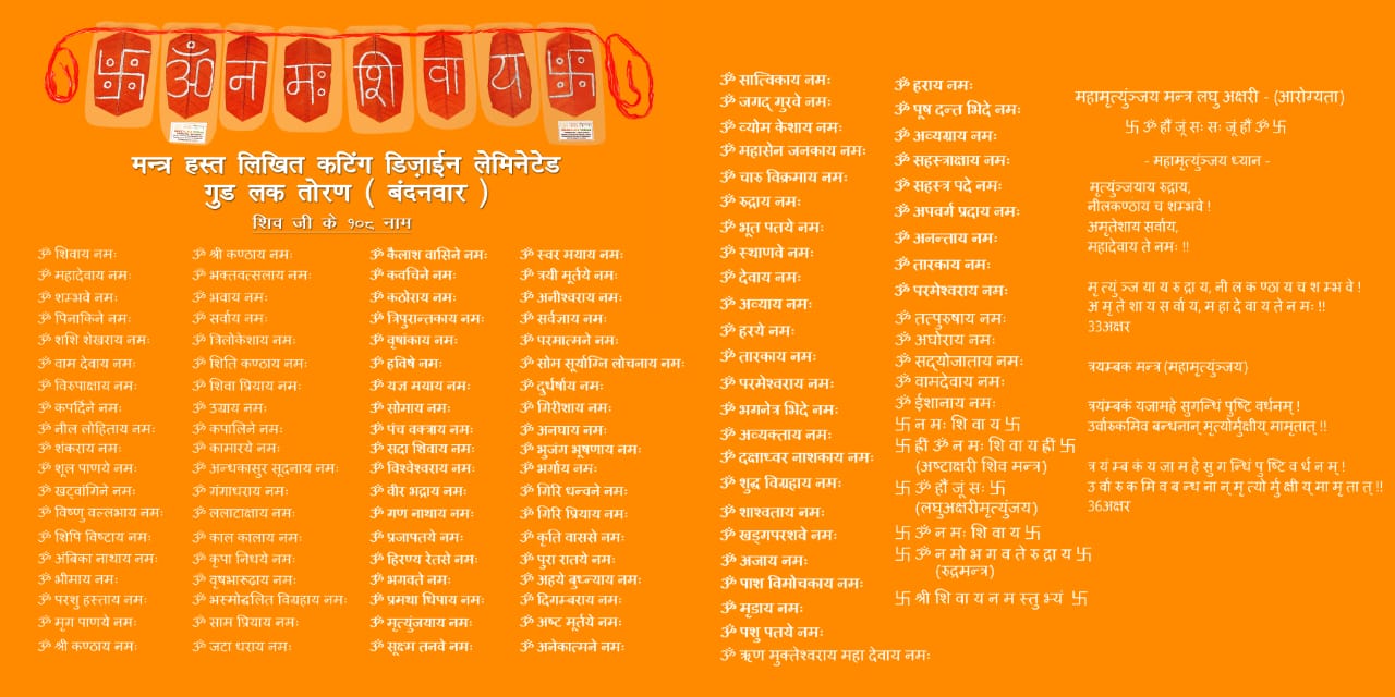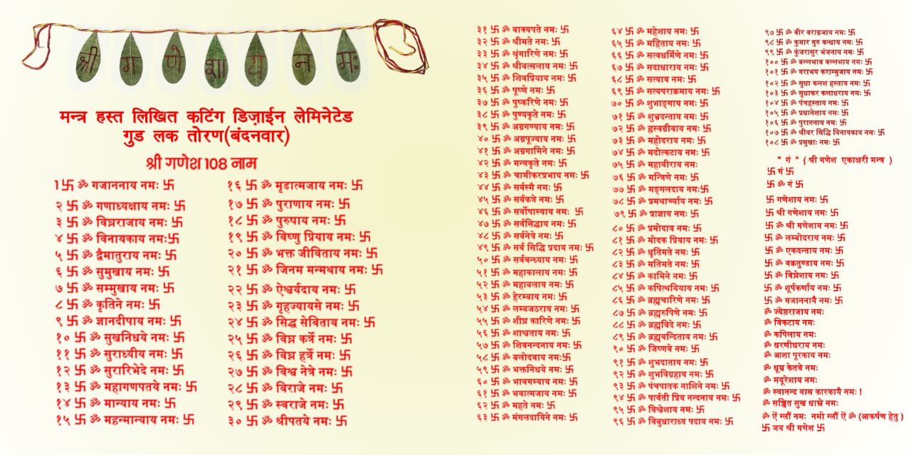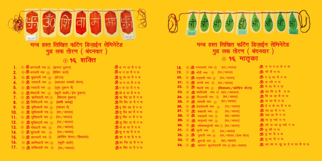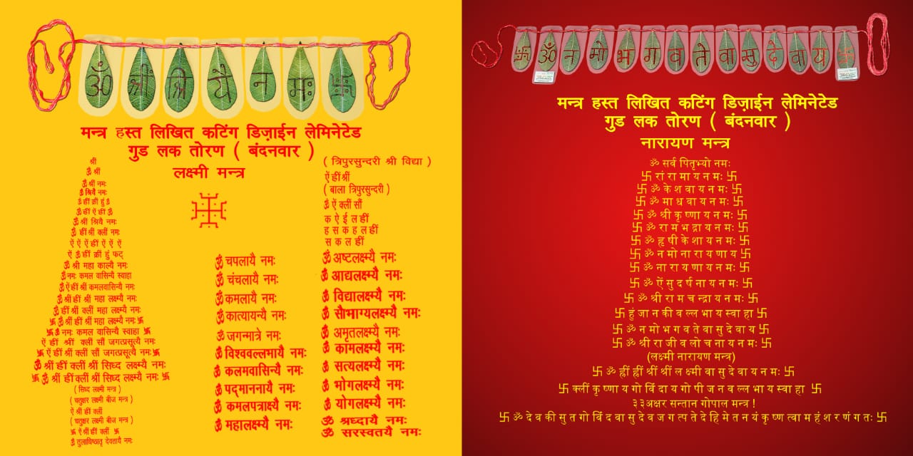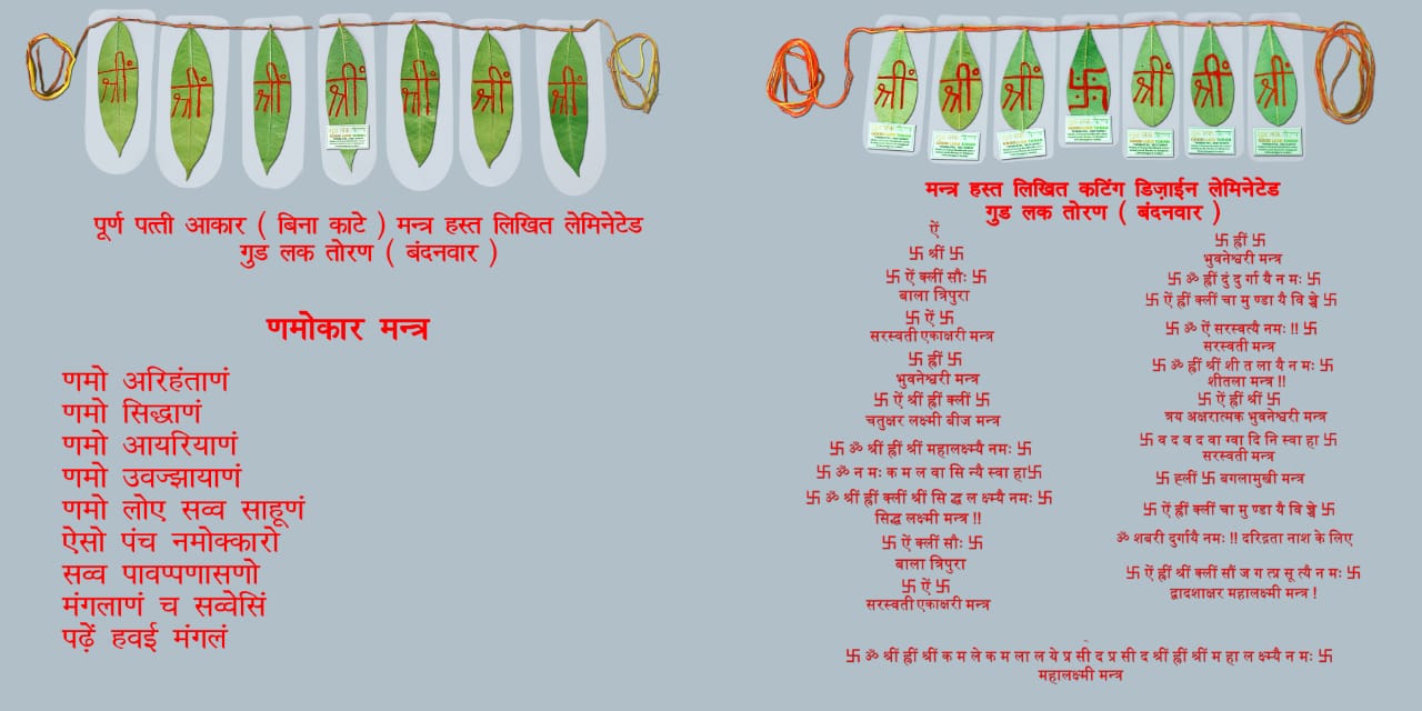 Cutting Design Mantra Hand written Good Luck Toran Bandanwar You can instruct us to prepare a handwritten, laminated Good Luck Toran (Bandhanwar) with any of the mantras mentioned here.