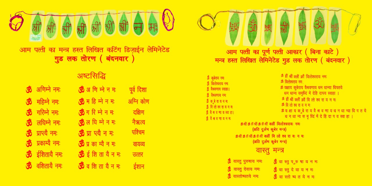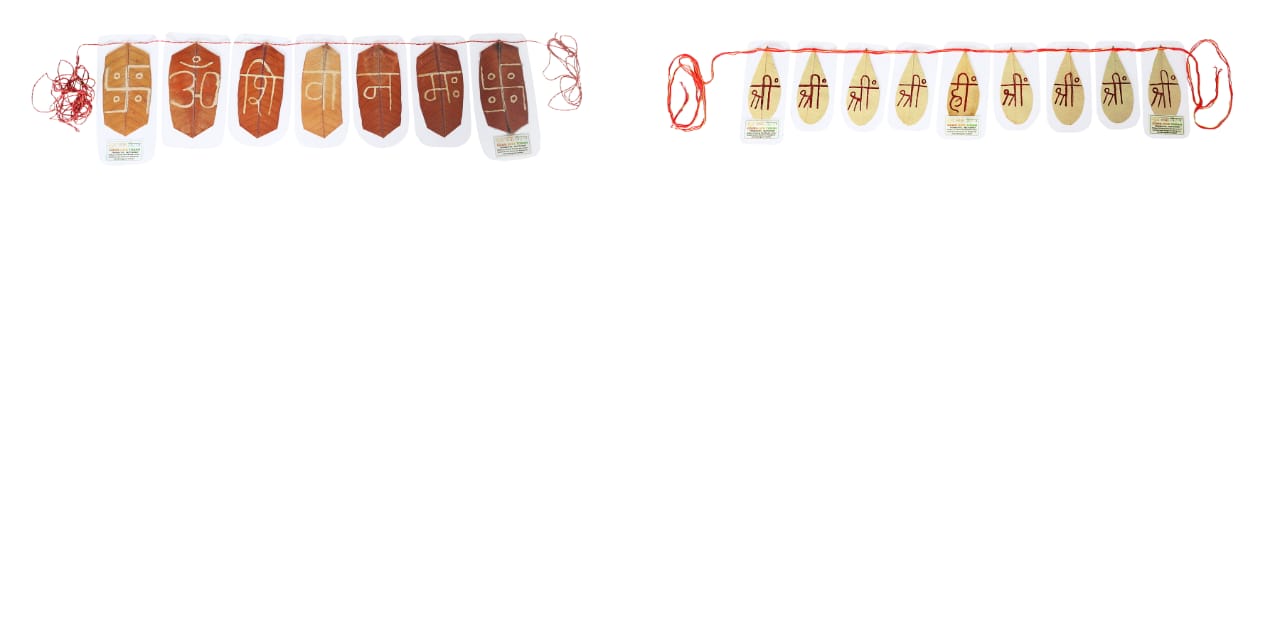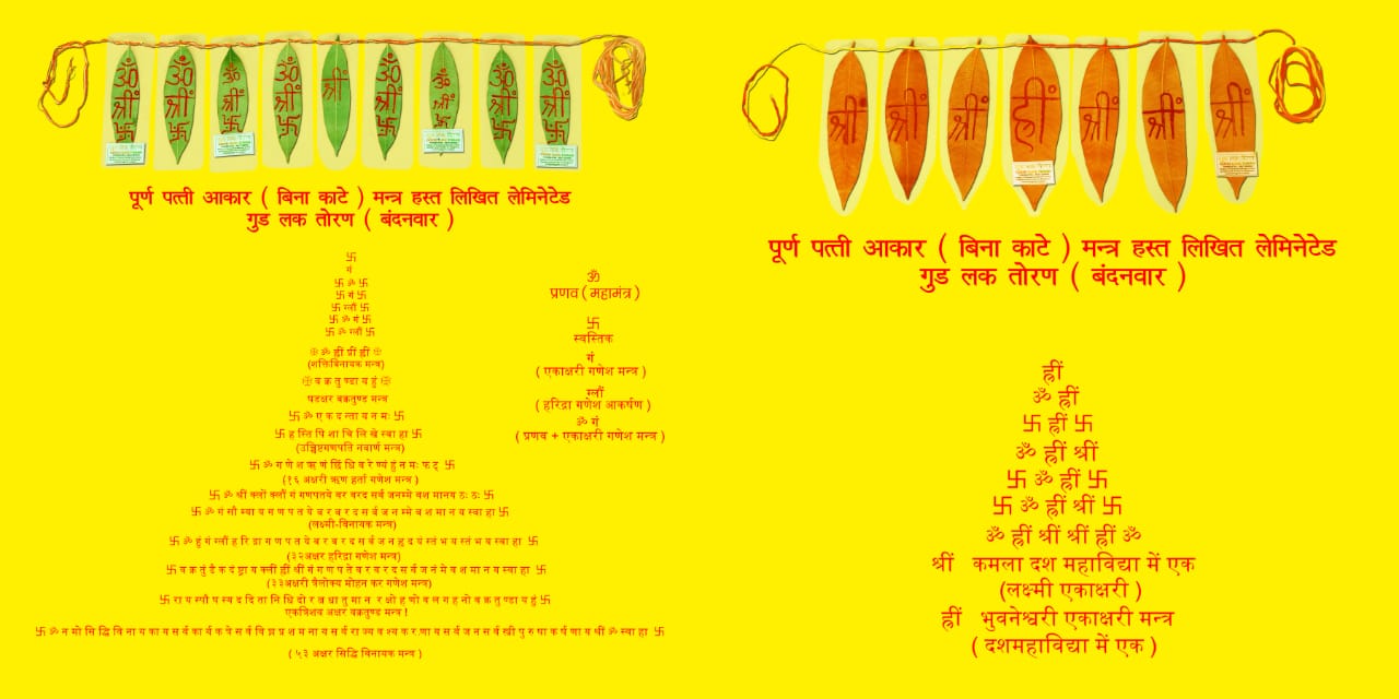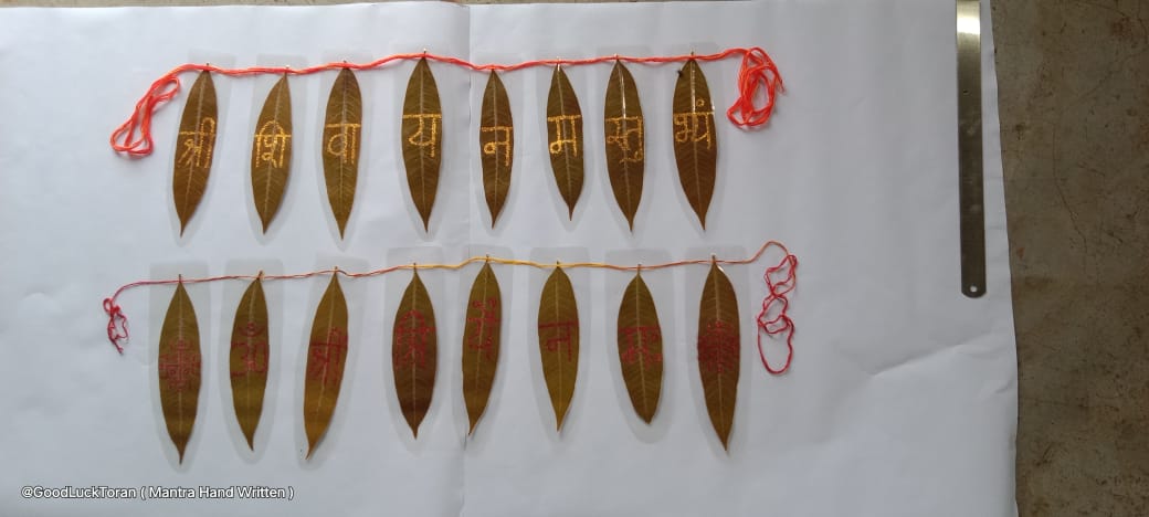Full leaf shape Mantra handwritten with ink of red sandalwood or white sandalwood (Malayagaar), by sprinkling mica on the leaf and laminated. Attractive Good Luck Toran Bandanwar can be made of different tree leaves according to person of different zodiac signs, like leaf of Mango tree, leaf of Banyan tree, leaf of Peepal tree, leaf of Jamun tree, leaf of Gular (Audumbar) tree, leaf of Sheesham tree, leaf of Peepal tree, leaf of Palash tree, leaf of Pakad (Gasti) tree, leaf of Reetha tree, leaf of Bael tree, leaf of Arjun tree, leaf of Madar (Aak) tree You can get "full leaf shape", "attractive good luck toran bandanwar" made of "full leaf shape", "red sandalwood or white sandalwood (malayagar) ink with mantra handwritten on it and by sprinkling mica on it" by taking advice from us.