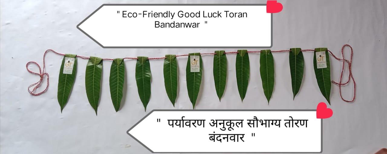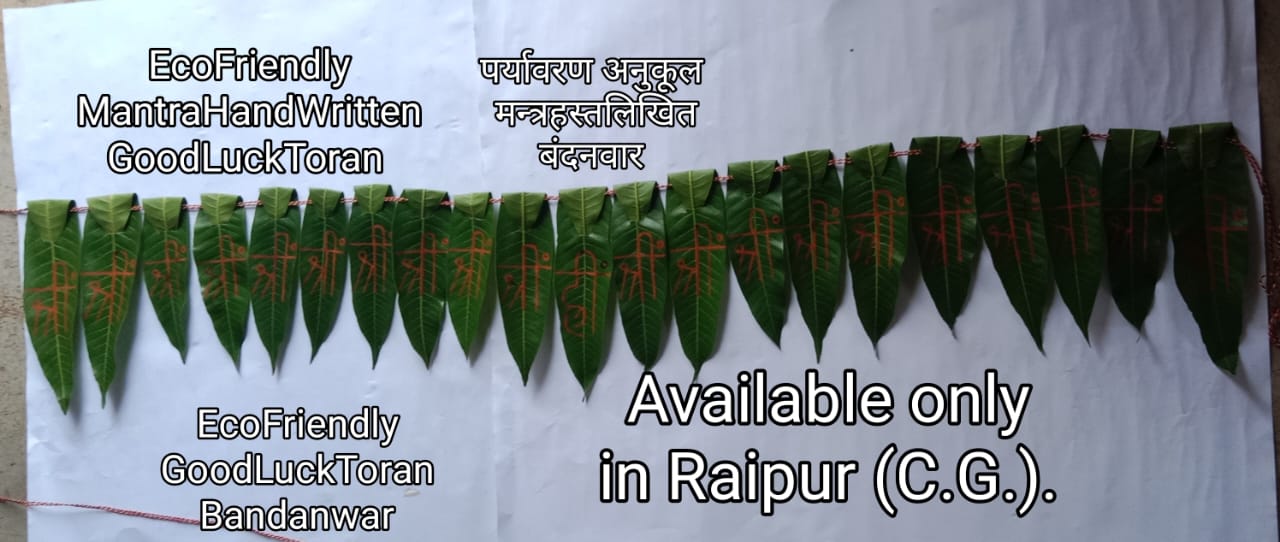 (Eco-Friendly Green Good Luck Toran Bandanwar ) made of mango leaf On an auspicious day and date, during an auspicious time, while chanting mantras or reciting stotras or reciting Chalisa, wash the leaves of mango tree with Gangajal, wipe them with a clean cloth, make a small cut on the leaf, fold it backwards and tie it in a Mawali (Kalava) thread to prepare " Eco-Friendly Good Luck Toran Bandanwar " . Special Benefits of Mango Leaf Good Luck Toran Eco-friendly bandanwar made from real mango leaves, costing ₹30 per leaf ( the price of a bandanwar depends on the number of mango leaves used, for example, a bandanwar with eleven leaves will cost ₹330 ). Currently, delivery is available only in Raipur city, Chhattisgarh, India. Only residents of Raipur city can get it.