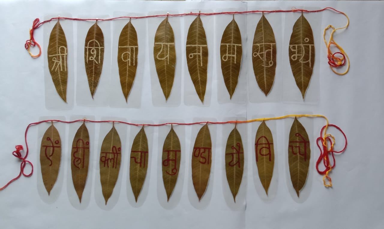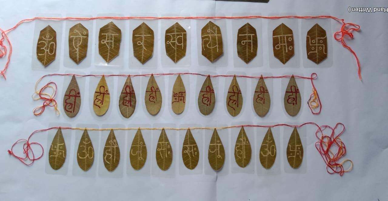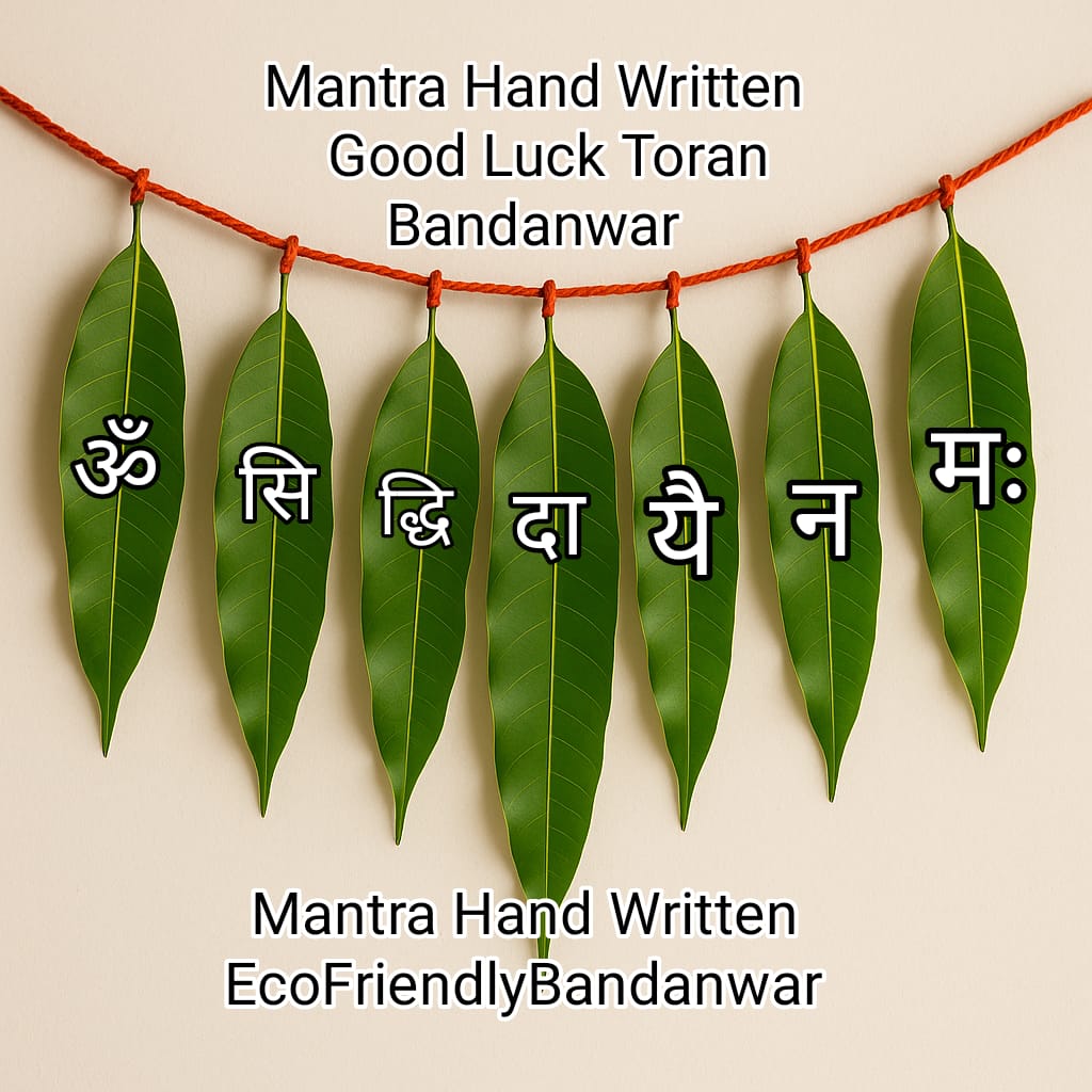 3) Mantra hand written eco friendly "Good luck toran" bandanwar (3 Mantra hand written eco friendly good luck toran bandanwar) on mango tree leaves using red sandalwood or white sandalwood (Malayagaar) ink