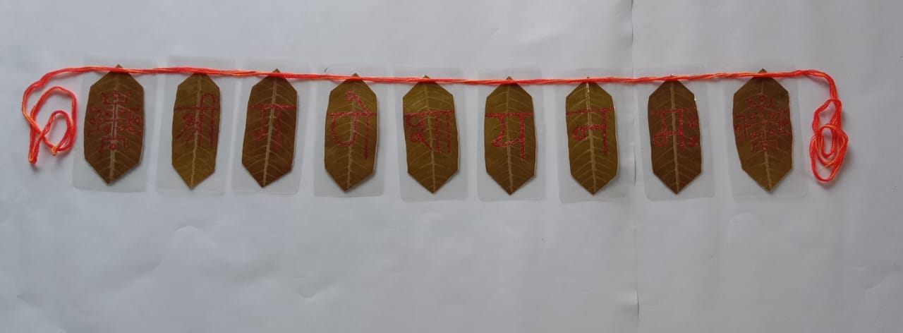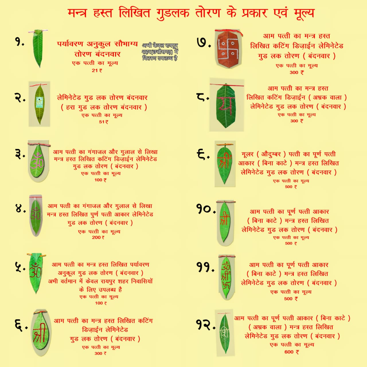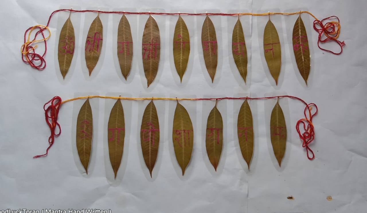 On auspicious date and day, in auspicious time, by us, while chanting mantras or reciting stotras or chalisa, in auspicious time, wash clean and fresh mango tree leaves with Gangajal and wipe them with clean cloth, offer special flowers, special leaves offered to goddess or god in temple (offered to god) by mixing red sandalwood with Gangajal and rubbing them on stone to prepare ink and using the same ink with special pen, recite mantras, stotras, chalisa etc. of gods and goddesses on the Gangajal washed mango tree leaves. Mantras of Gods and Goddesses are written by handwriting them and weaving them with Kalawa (Mawali thread) to make a handwritten eco-friendly Good Luck Toran (Bandanwar). Currently, distribution of eco-friendly handwritten mantra good luck toran bandanwar is available only in Raipur city (Chhattisgarh). Cost of one leaf is ₹100. (Mantra handwritten bandanwar made of mango leaves can be made of 11,13,15,21,31,51 leaves or of as many letters as the mantra has.) If you are from Raipur city, Chhattisgarh, then you can get it from us by ordering one week in advance on all auspicious occasions (any deity worship like Ganesh worship, Shiv worship, Durga worship, griha pravesh worship, engagement, marriage, etc.)